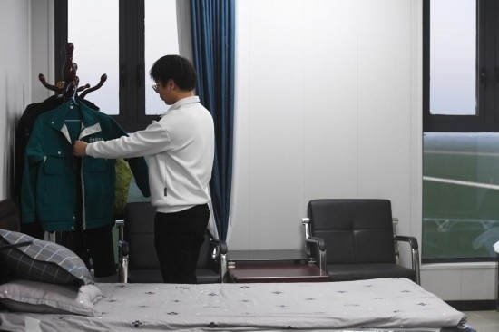 3月14日,在西平縣老王坡高標(biāo)準(zhǔn)服務(wù)中心的宿舍內(nèi),臺曉林下班后換下工作服、整理衣架。
