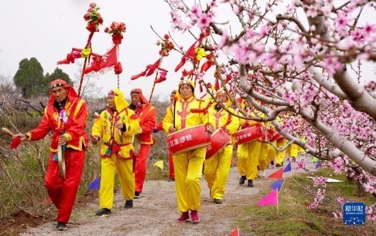 3月24日,在陜西省西安市臨潼區(qū)零口街道零塬村,當?shù)氐姆俏镔|(zhì)文化遺產(chǎn)“百面鑼鼓”隊伍穿行于桃園中。