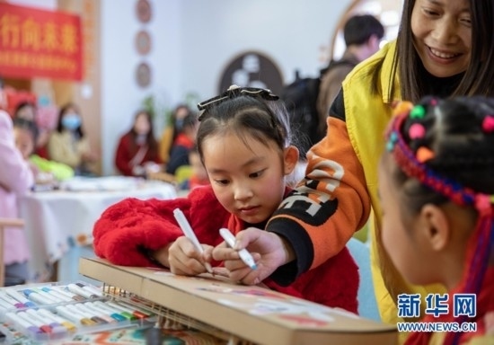 8歲的土旦卡卓是來自青海玉樹藏族自治州的藏族小朋友,她在為手中紙質(zhì)瑤琴涂畫的同時也學(xué)習(xí)著其他民族的文化風(fēng)俗。