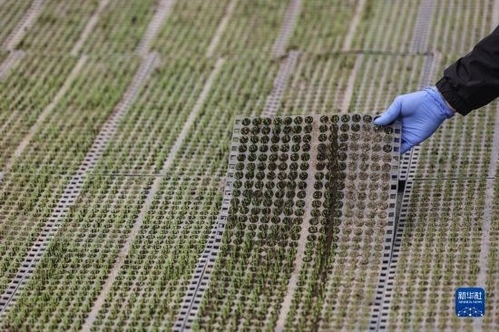 4月14日,盤錦市盤山縣的農(nóng)戶在查看水稻秧苗的育苗情況。