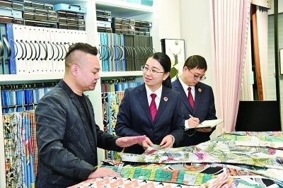 浙江省紹興市柯橋區(qū)被稱為“國際紡都”。2022年,柯橋區(qū)人民檢察院通過大數(shù)據(jù)監(jiān)督模型,監(jiān)督糾正62件花樣著作權(quán)虛假訴訟案件,入選2022年知識(shí)產(chǎn)權(quán)檢察十大案事例。圖為辦案人員在走訪商戶??聵騾^(qū)人民檢察院供圖