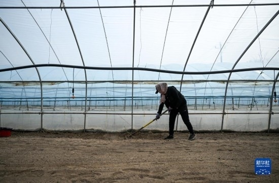 4月14日,在通遼市科爾沁左翼后旗甘旗卡鎮(zhèn),工人在水稻育苗大棚里整理土地。