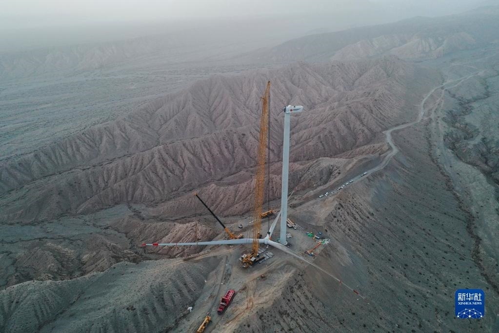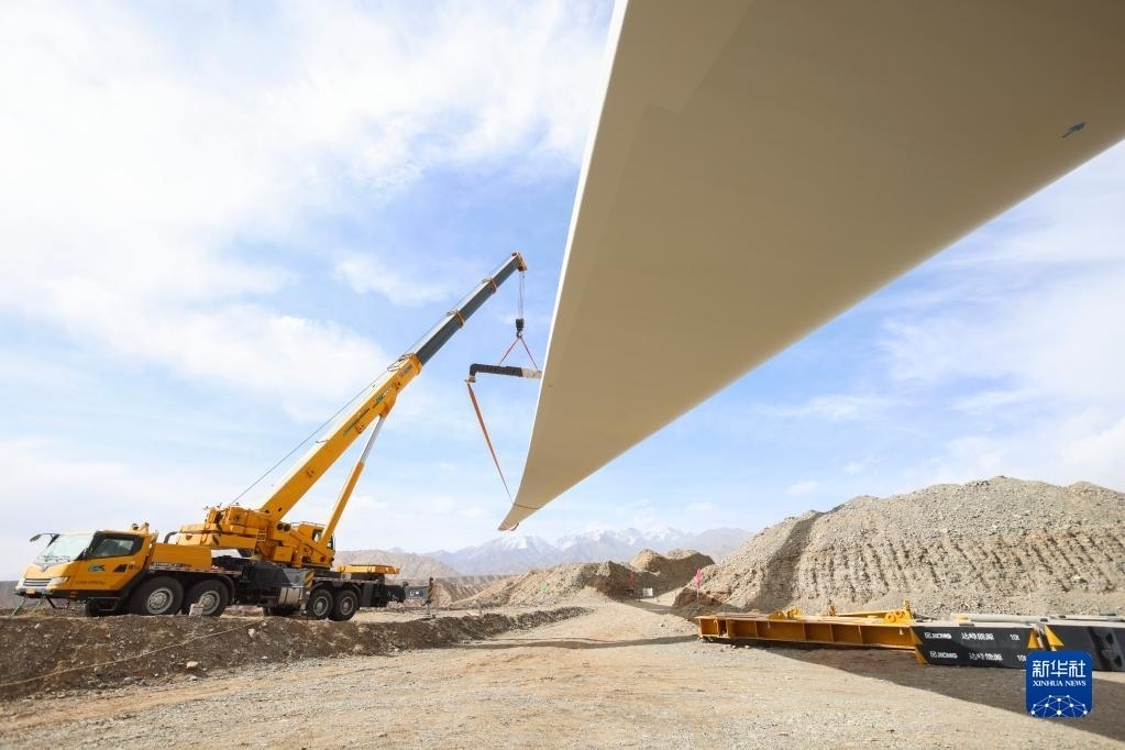 在新疆克孜勒蘇柯爾克孜自治州烏恰縣,風機葉輪提升至相應高度后與機艙對接(4月21日攝)。