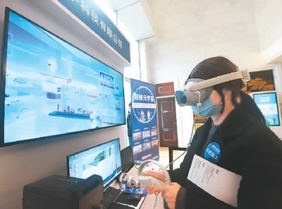 3月16日,在浙江省杭州市2023西溪大會·全球數(shù)字科技峰會上,虛擬現(xiàn)實產品設計師利用VR技術探索“超維元宇宙”。龍 巍攝(人民視覺)