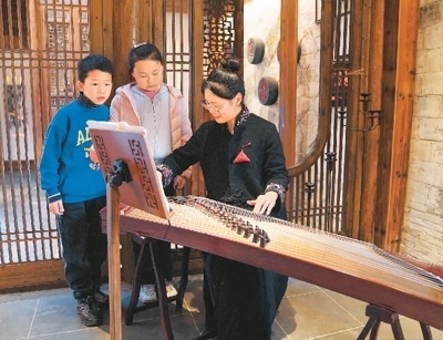 4月9日,在安徽省黟縣石亭村的民宿“拾庭畫驛”內,民宿管家在為小朋友演奏傳統(tǒng)樂器。新華社記者 馬 寧攝