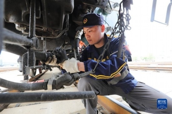 4月28日,中國(guó)鐵路上海局集團(tuán)有限公司徐州站的鐵路連結(jié)員在進(jìn)行制動(dòng)軟管摘除作業(yè)。