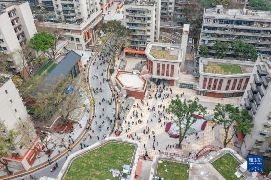 4月28日,在竣工亮相的重慶市九龍坡區(qū)謝家灣街道民主村片區(qū)城市更新項(xiàng)目(一期),人們在一處公共空間休息(無人機(jī)照片)。