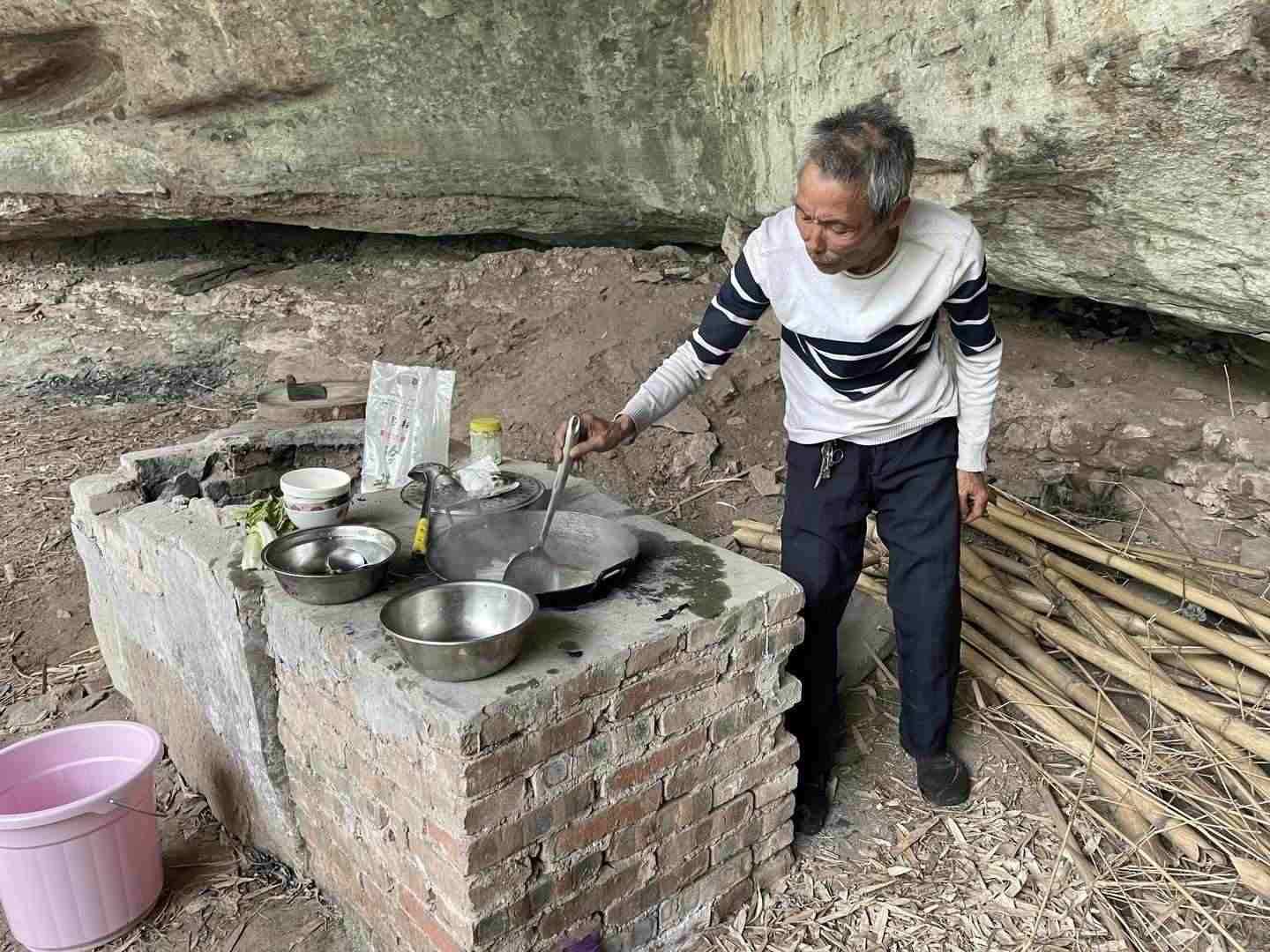 紅星新聞記者觀察發(fā)現(xiàn),巖洞里確實沒有豬油或菜油,只有小半袋米和半袋鹽。但巖洞里有灶臺。據(jù)說很久以前這個洞里住過人,但已去世幾十年;后來,還有人在洞里養(yǎng)雞,巖洞里有兩間像房子的構(gòu)筑物,但是沒有門。馮必全砍了幾根竹子搭架做床,棉被褥子則是鄉(xiāng)親們不要的物件,他去要過來的。