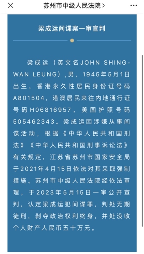 ·梁成運犯間諜罪一審被判無期徒刑。