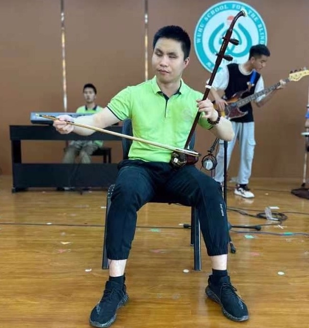 2021年,先天性失明的毛歡笑來到蕪湖市盲人學(xué)校后,沒有錯過黑眼睛樂隊在校園里的任何一次演出。
