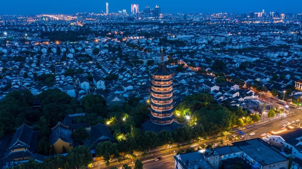 這是2020年8月24日在蘇州市姑蘇區(qū)拍攝的城區(qū)夜景(無人機(jī)照片)。新華社記者 李博 攝