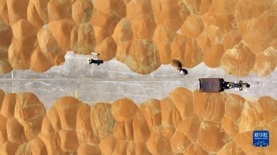 6月9日,江蘇省淮安市淮安區(qū)白馬湖農(nóng)場工人在晾曬小麥(無人機照片)。