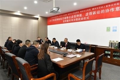 嵊州市委政法委、市法院、市檢察院、市公安局、市勞動(dòng)仲裁委聯(lián)合舉行《關(guān)于防范和制裁勞動(dòng)爭議虛假仲裁、虛假訴訟的協(xié)作意見》發(fā)布暨專項(xiàng)治理啟動(dòng)儀式。