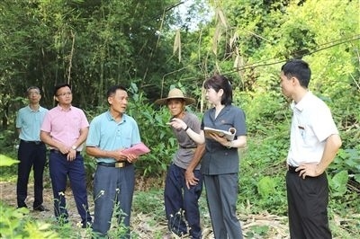 清遠中院法官到巖前村對一起土地承包經(jīng)營權糾紛案進行實地走訪。