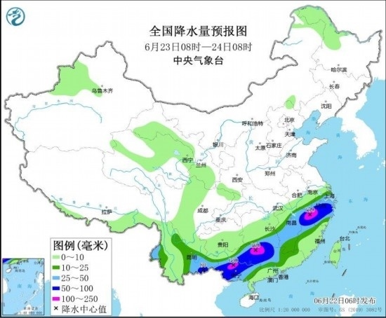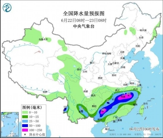 圖3 全國降水量預報圖(6月22日08時-23日08時) 圖自中央氣象臺網(wǎng)站