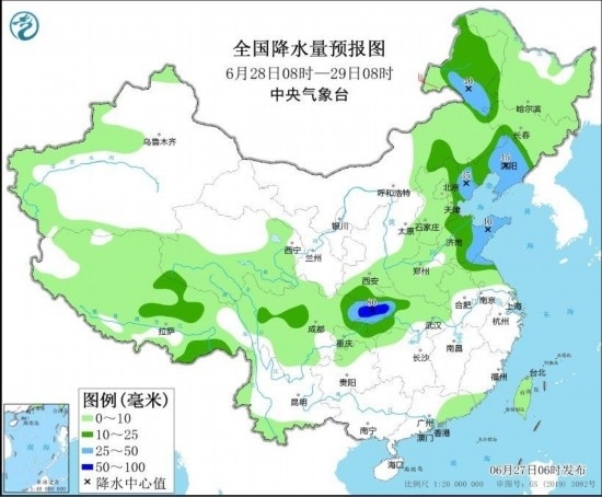 6月27日08時至28日08時,甘肅東南部、陜西、四川盆地、內(nèi)蒙古中部和東北部、山西西部、黑龍江西部和東南部、吉林東北部、廣東東南部等地部分地區(qū)有中到大雨,其中,山西西部、陜西西南部、四川盆地北部等地部分地區(qū)有暴雨或大暴雨(100~110毫米)。西北地區(qū)東部、華北、江南東部、西藏南部等地部分地區(qū)有4~6級風(fēng),其中,內(nèi)蒙古西北部部分地區(qū)有6~7級風(fēng)(見圖2)。