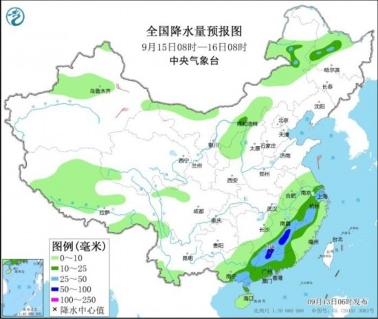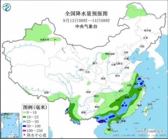 全國降水量預報圖(9月13日08時-14日08時)