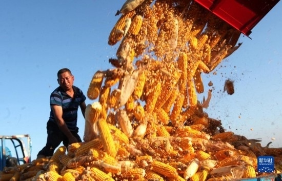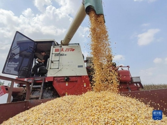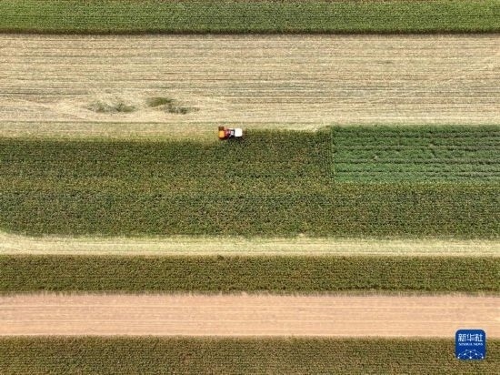 9月14日,農(nóng)民駕駛農(nóng)機在河南省駐馬店市汝南縣羅店鎮(zhèn)袁莊村收獲成熟的玉米。