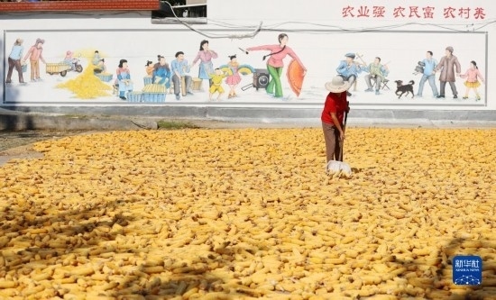 9月14日,山東省臨沂市郯城縣郯城街道東南村村民在晾曬收獲的玉米。