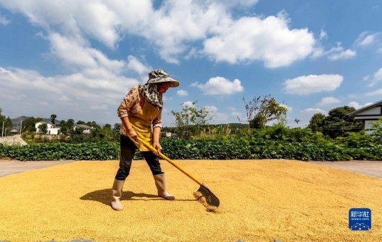 金秋時節(jié),各地農(nóng)民搶抓晴好天氣忙收獲,田間地頭一派繁忙景象。新華社發(fā)(磨桂賓 攝)