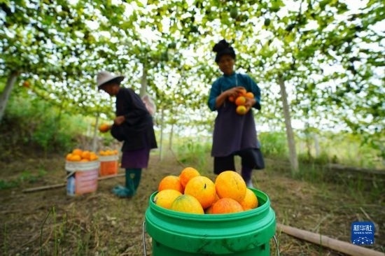 9月14日,果農(nóng)在貴州省開陽縣南江鄉(xiāng)龍廣村水果種植基地采摘醉金香葡萄。