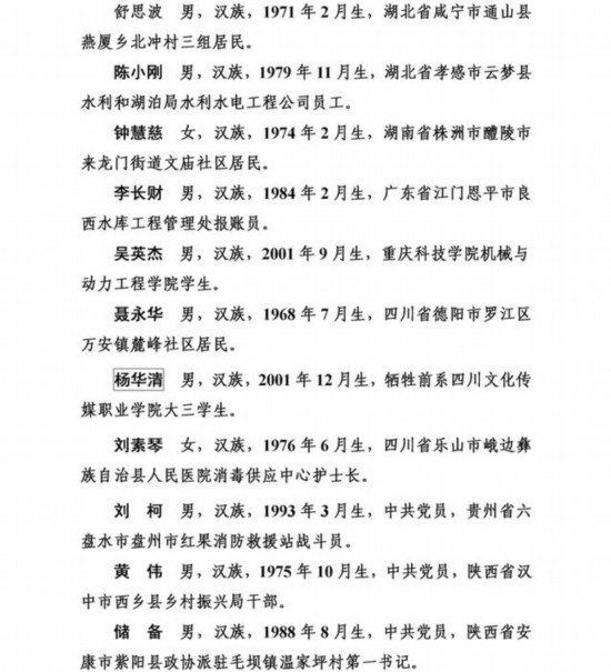 上榜勇士中,有從高橋上跳水救人導(dǎo)致胸椎骨折的外賣小哥彭清林和另一位高橋跳水救人的中學(xué)教師丁成闖;有冒著9級(jí)大風(fēng)在海上營(yíng)救遇險(xiǎn)臺(tái)胞的漁民蔡芳輪、蔡勝利;有放棄登頂珠峰機(jī)會(huì)而救助同胞的珠峰登山隊(duì)隊(duì)員范江濤、謝如祥;有萬(wàn)米高空機(jī)艙里搶救瀕危病人的護(hù)士長(zhǎng)劉素琴;有勇斗盜賊被刺幾刀仍不退縮的江蘇村民李培武;有身患癌癥卻橫渡淥江河救人的樂(lè)觀大姐鐘慧慈;有跳進(jìn)充滿沼氣深井救人致多器官感染的山東小伙李字旭;更有冒死救援落水群眾壯烈犧牲的潘燦燦、朱先鴿、尹新朋、喬軍、徐毅暉、楊華清、陳江七位勇士,讓我們致以最崇高的敬意!