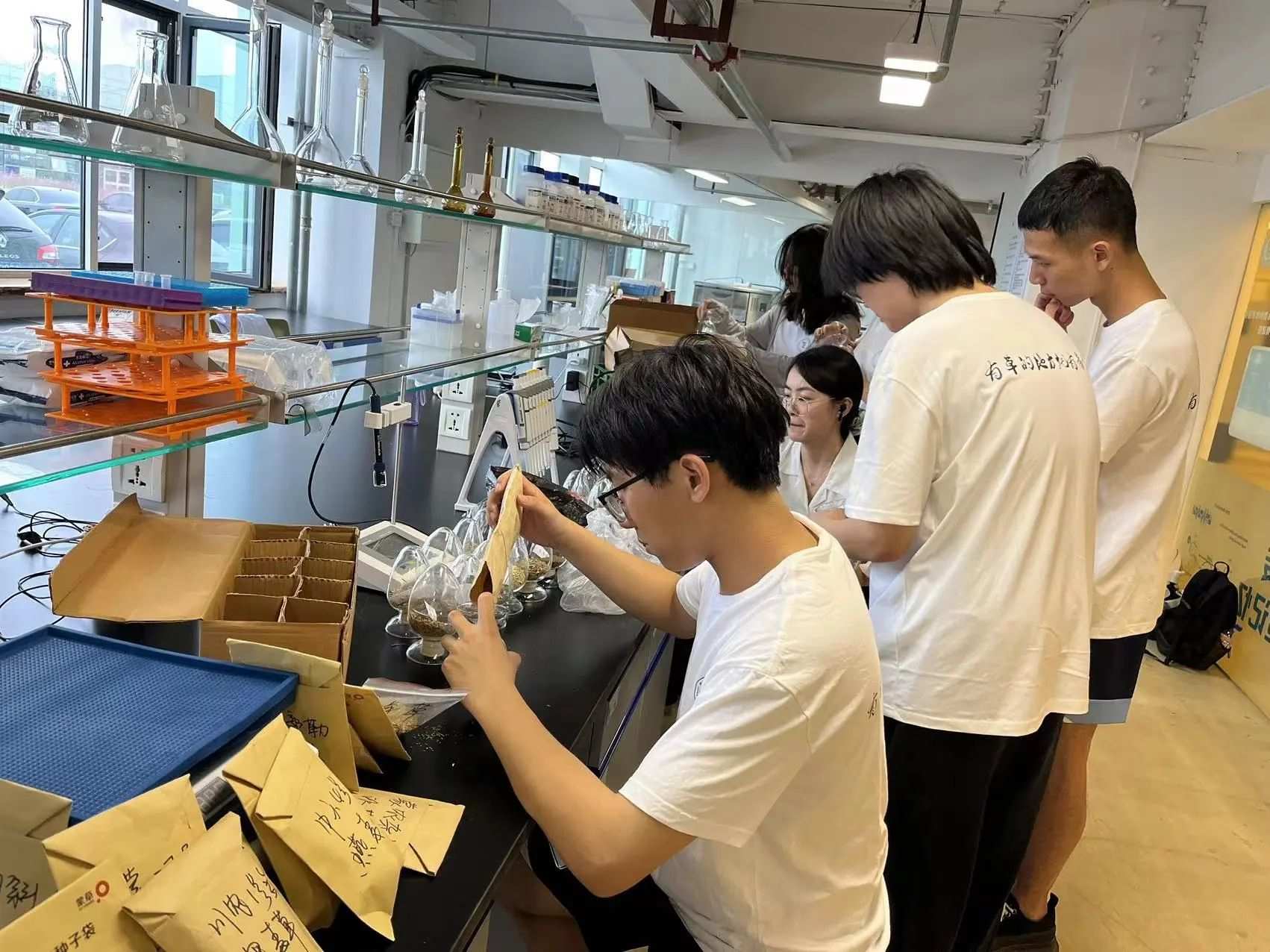 在老師的帶領(lǐng)下,同學(xué)們參觀了蒙草公司制作的各種植物以及土壤標(biāo)本,在地下冷庫見識了收錄的各種各樣的草種。隨后,同學(xué)們進(jìn)入實驗室,先后對20種草種進(jìn)行裝瓶、貼簽,再分揀,對一些常見的田間雜草進(jìn)行識別和辨認(rèn),運用所學(xué)知識在田間除草,并在除過草的地塊播種。其間,他們還學(xué)習(xí)了如何科學(xué)系統(tǒng)地測量和記錄農(nóng)作物的數(shù)據(jù),用游標(biāo)卡尺和卷尺對南瓜、大豆、辣椒等作物的株高、莖粗、株型以及花色進(jìn)行觀察、測量和記錄。