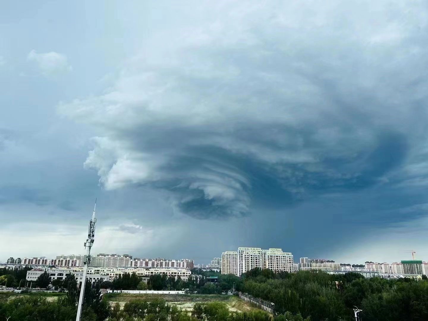7月6日14時左右,通遼市科爾沁區(qū)上空出現超級單體風暴,只見巨型氣旋籠罩在上空,直逼地面,猶如電影特效,不少市民被這壯觀的景象震撼到。