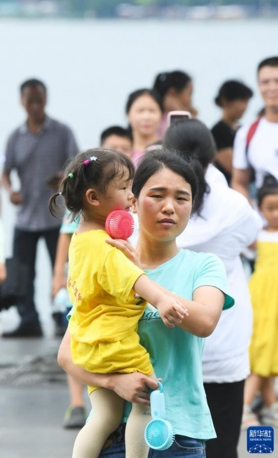 7月10日,在杭州西湖景區(qū),一位母親手持兩個(gè)風(fēng)扇和女兒游玩。
