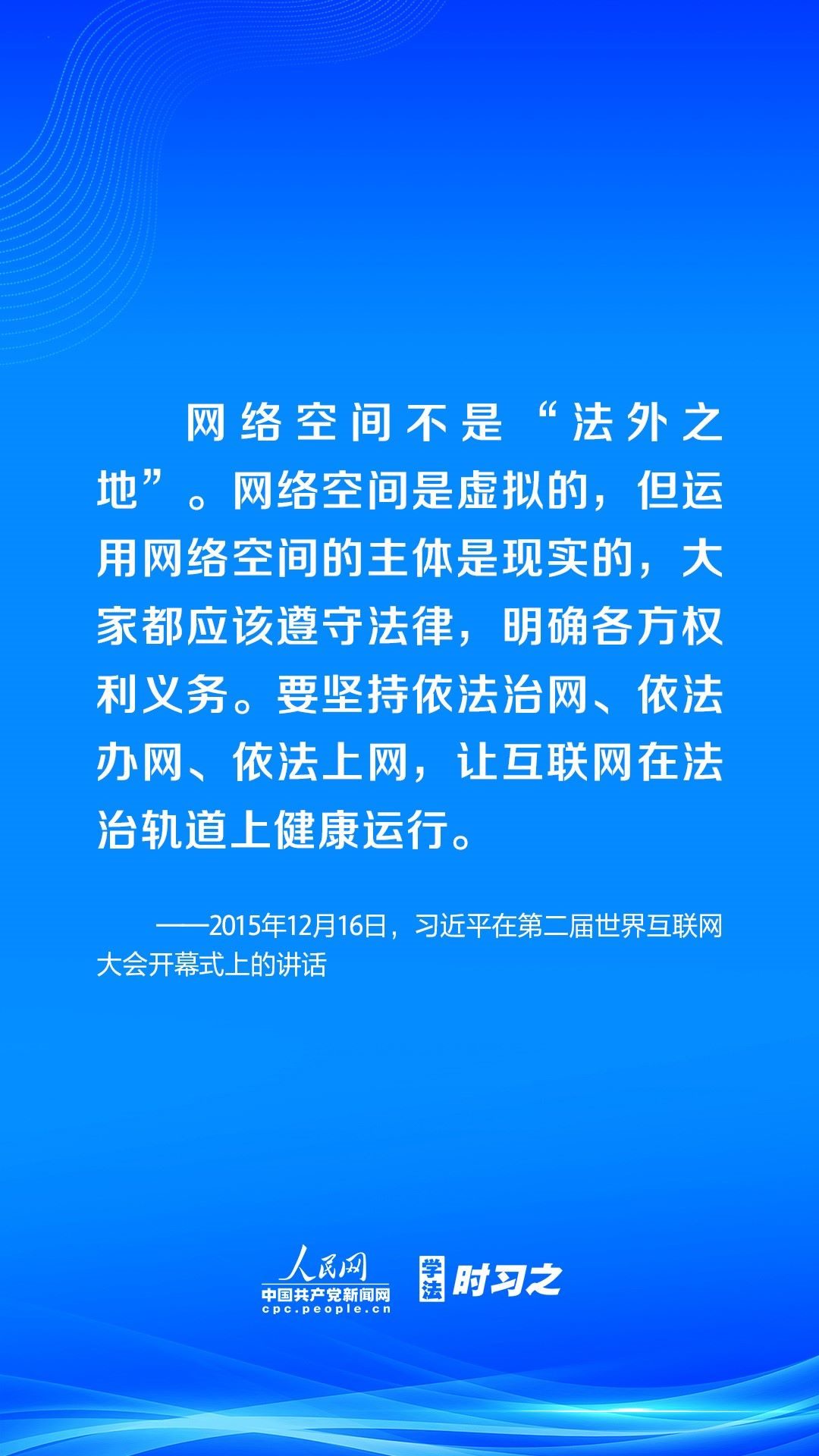 營造風(fēng)清氣正的網(wǎng)絡(luò)空間,離不開法治手段的保障。黨的十八大以來,習(xí)近平總書記高度重視網(wǎng)絡(luò)法治工作,強(qiáng)調(diào)要堅持依法治網(wǎng)、依法辦網(wǎng)、依法上網(wǎng),讓互聯(lián)網(wǎng)在法治軌道上健康運行。