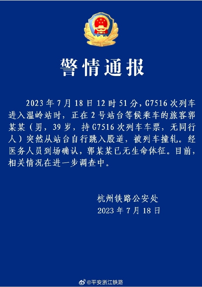 ·警方通報(bào):溫嶺跳下高鐵站臺(tái)男子已無生命體征。