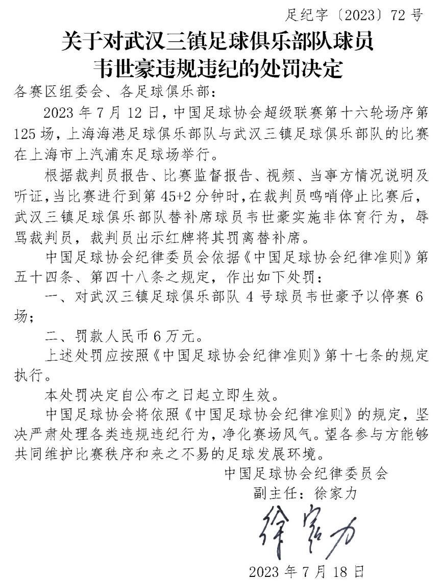 ·18日,中國足球協(xié)會(huì)紀(jì)律委員會(huì)發(fā)布重磅罰單,球員韋世豪辱罵裁判,被停賽6場罰款6萬。