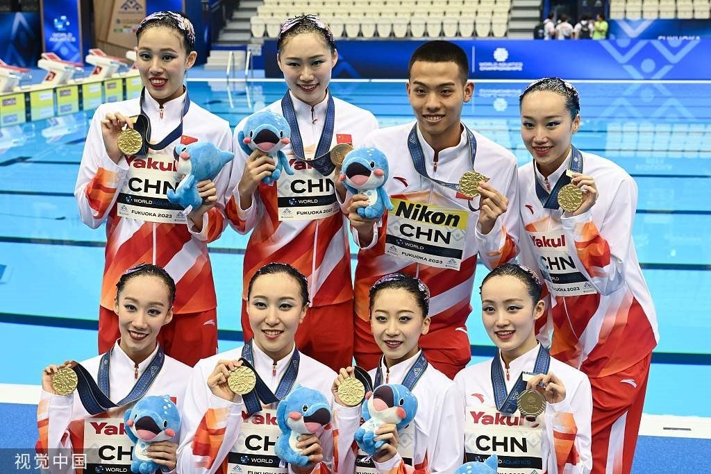 7月17日,2023年福岡游泳世錦賽,石浩玙(后排右二)隨中國隊(duì)拿下花游集體技巧自選項(xiàng)目金牌。