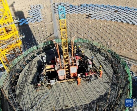 7月21日,在阿克塞千萬千瓦級可再生能源多能互補基地,工人在匯東新能源75萬千瓦光熱+項目建設(shè)現(xiàn)場施工。新華社發(fā)(馬曉偉 攝)