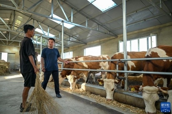 8月3日,在扎魯特旗巨日合鎮(zhèn),百順養(yǎng)殖專業(yè)合作社負(fù)責(zé)人楊紹武(右)和養(yǎng)殖戶李和查看牛犢繁育情況。