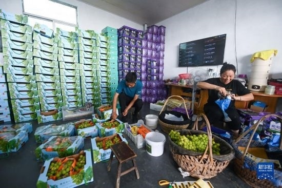 8月20日,在諸暨市姚江鎮(zhèn)紫草塢村阿群家庭農(nóng)場內(nèi),種植戶打包成熟的葡萄,準備運往市場。