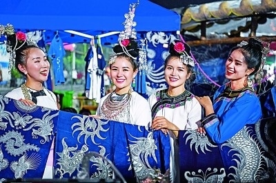 村民在貴州“村超”賽場旁的文創(chuàng)攤位展示民族服飾。新華社發(fā)