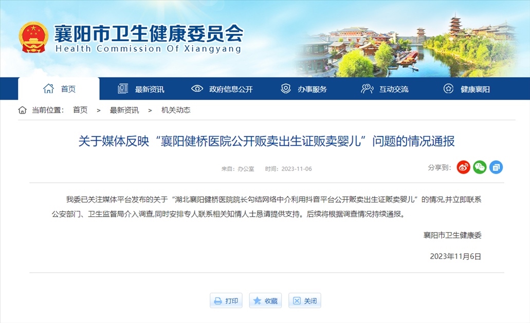 ·醫(yī)院院長(zhǎng)被舉報(bào)涉嫌販賣(mài)出生證,襄陽(yáng)衛(wèi)健委通報(bào):聯(lián)系公安部門(mén)、衛(wèi)生監(jiān)督局介入調(diào)查,同時(shí)安排專(zhuān)人聯(lián)系相關(guān)知情人士懇請(qǐng)?zhí)峁┲С?。后續(xù)將根據(jù)調(diào)查情況持續(xù)通報(bào)。