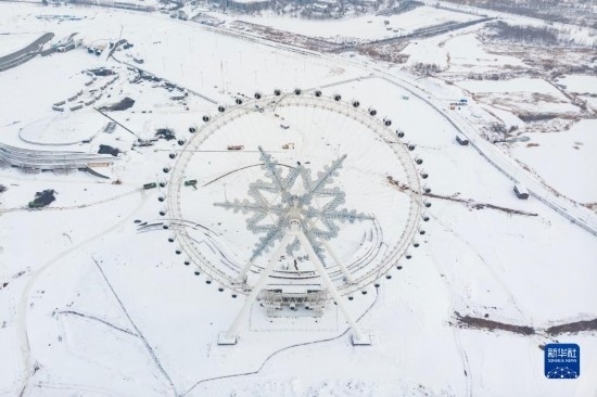 這是11月9日拍攝的位于哈爾濱冰雪大世界園區(qū)內(nèi)的雪花摩天輪(無(wú)人機(jī)照片)。