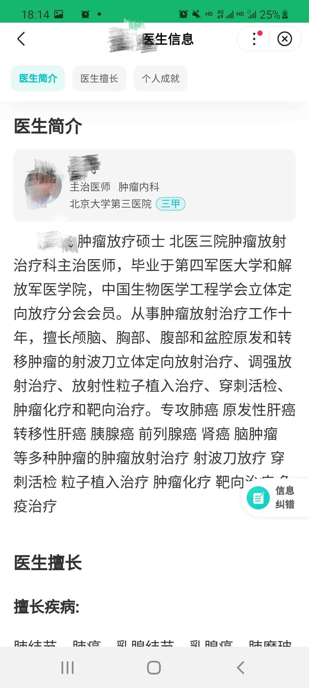 吳先生發(fā)給記者的百度健康頁面上顯示:這位醫(yī)生是腫瘤內(nèi)科的主治醫(yī)師,但其個人介紹里又寫著他是腫瘤放療科主治醫(yī)師,放療科醫(yī)生的執(zhí)業(yè)證書和內(nèi)科不同,吳先生也對平臺提出過質(zhì)疑,醫(yī)生到底是哪個科的?是否專業(yè)?
