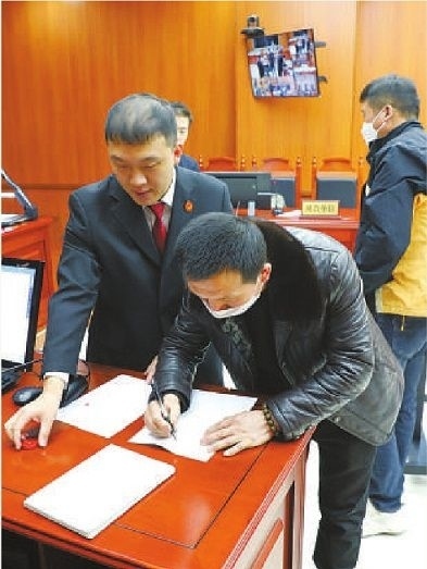 二審宣判后,農(nóng)民工代表簽字領(lǐng)取被拖欠的工資。