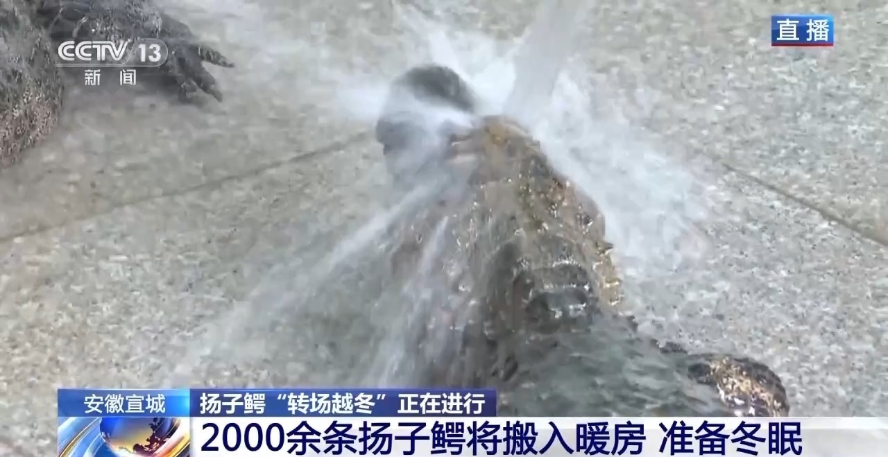 由于今年的溫度比較高,與往年相比,轉(zhuǎn)場越冬推遲了十天左右。轉(zhuǎn)場是按照從小到大的順序。今天是第一天,率先搬家的主要是7歲以下的幼鱷,它們對環(huán)境的適應(yīng)能力更弱一些,需要盡快搬進(jìn)室內(nèi)。在搬進(jìn)暖房之前,揚(yáng)子鱷需要先進(jìn)行沖洗、消毒?!鞍布摇焙螅蕉康臏囟葧3衷?0℃左右,并且有工作人員定期打掃、保濕,確保揚(yáng)子鱷安全過冬。