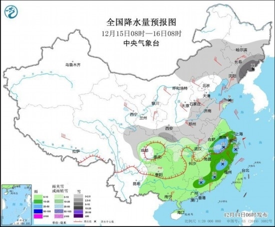 12月14日至15日,中東部地區(qū)有大范圍雨雪天氣過(guò)程,西北地區(qū)中東部、內(nèi)蒙古、華北、黃淮中北部、遼寧、吉林有小到中雪,其中陜西南部、華北南部、黃淮北部、遼寧東部、吉林東部等地的部分地區(qū)有大到暴雪,局地大暴雪或特大暴雪;陜西南部、河南、山東中部、湖北西部和東北部、安徽西部等地部分地區(qū)有凍雨;黃淮南部、江淮、江漢、重慶及江南等地有中到大雨,局地暴雨,部分地區(qū)伴有高架雷暴。