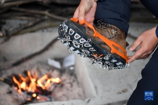 12月19日,尹斌在110千伏西公線(xiàn)003號(hào)監(jiān)測(cè)哨所休息后穿上冰爪。