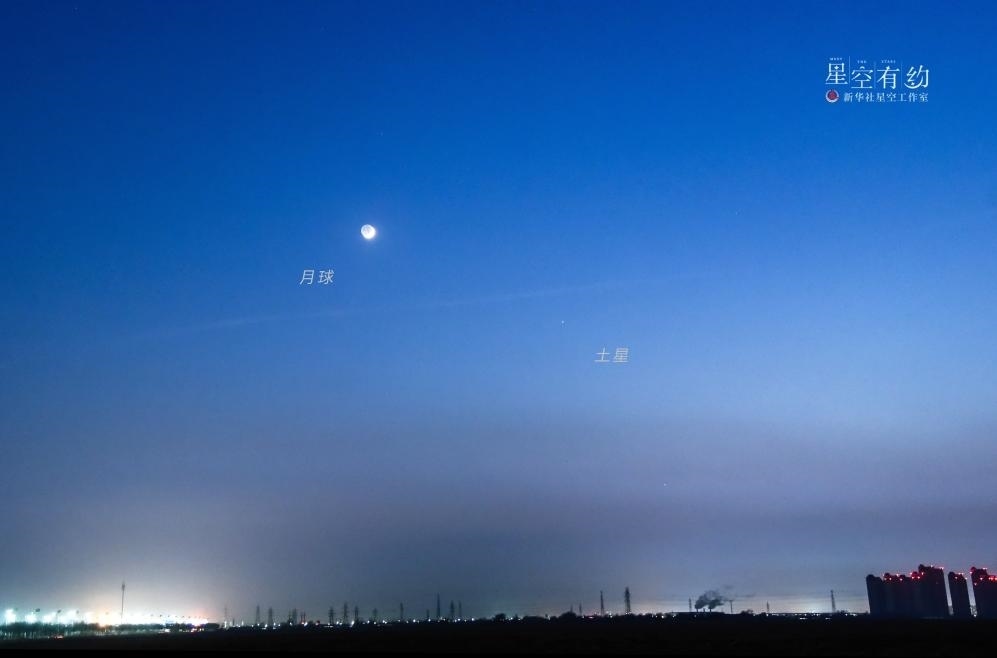 天津星空攝影愛好者楊婧2022年1月5日在天津靜海團(tuán)泊湖拍攝的土星伴月。(本人供圖)