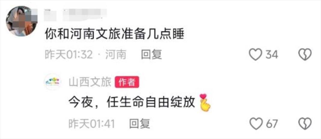 有網(wǎng)友稱“河南文旅按小時發(fā),咱們山西按分鐘發(fā)”,“山西文旅你勤快得讓我有點陌生”,凌晨,山西文旅小編仍在與網(wǎng)友互動——