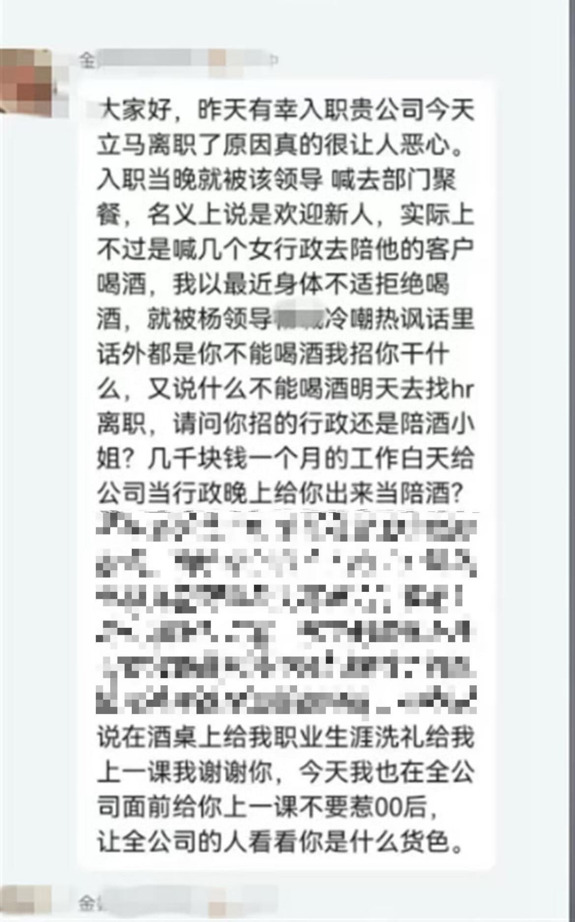 ·南京一00后女員工被要求陪客戶喝酒憤而辭職?涉事公司稱其捏造事實,警方介入:正在調(diào)查處理。