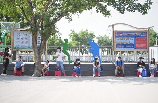 2021年6月12日,北京豐臺(tái)二中附屬看丹小學(xué)門外,陸續(xù)有家長(zhǎng)帶著相關(guān)材料排隊(duì)等待9點(diǎn)準(zhǔn)時(shí)開啟的入學(xué)信息審核。視覺中國(guó)供圖