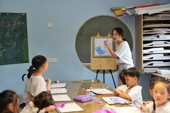 2022年7月21日,江西一幼兒園里的孩子在老師的指導(dǎo)下練習(xí)繪畫。視覺中國(guó)供圖