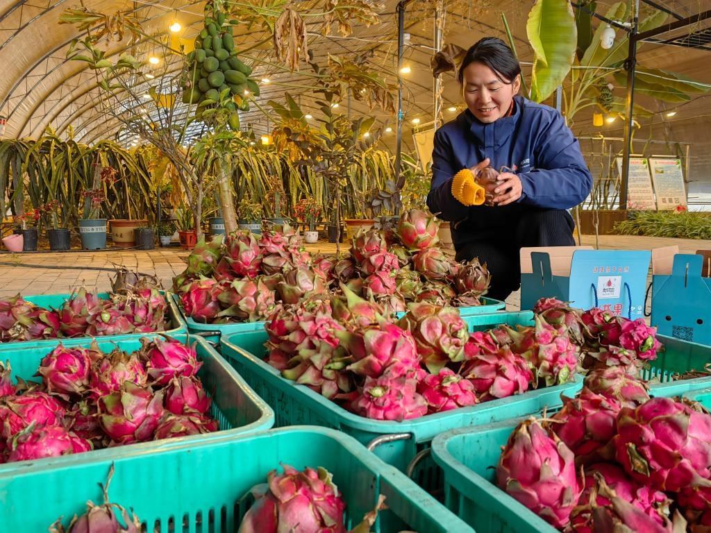 棚外冷風陣陣,棚內暖風和煦。新春伊始,當記者走進陜西楊凌農業(yè)高新技術產業(yè)示范區(qū)下轄的楊陵區(qū)揉谷鎮(zhèn)田東村時,看到一個個火龍果大棚里,果農們正將色澤艷麗的果實裝箱、打包。銷售已近尾聲,豐收的喜悅伴著濃濃的年味兒。